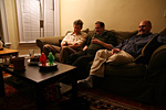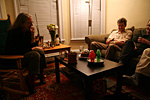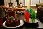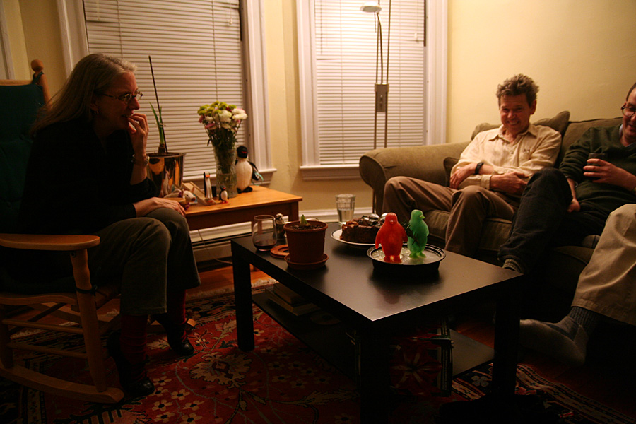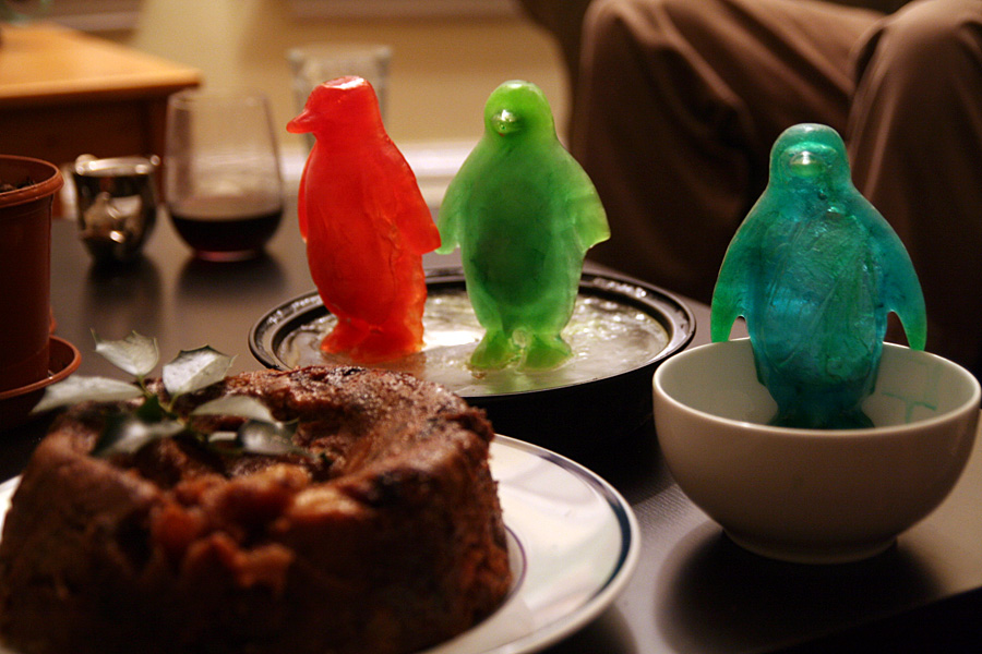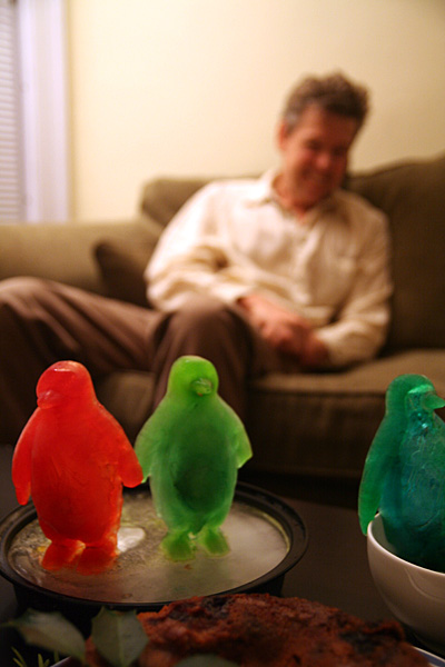 i normally don't celebrate christmas but i was invited to a small holiday dinner by my neighbors bruce and jack, along with their landlord friends susan and dennis. bruce wore special glasses for the occasion. i brought some flowers and two bottles of wine (australian red and a japanese plum wine). jack made dinner: pork tenderloins wrapped in bacon, a potato stew with fruits and dates, and some string beans. susan and dennis had presents for everyone. bruce and jack got an amaryllis plant while i got a southeastern asia dvd. dessert came in form of an apple cake made by susan, served with heaps of ice cream. by the second piece i almost burst from overeating and sheer sugar overload. the visual highlight of the evening was when bruce brought out his ice penguin centerpiece, dyed with food colors for those holiday hues. later he brought out two abortive attempts, a blue penguin and a blueish green penguin. we talked about finding televisions, eskimo cholesterol, neighborhood gossip, baby seal blubber, nagging aging parents who are seemingly immortal, natural springs (sulfurous or carbonated kind), why dennis is so thin and hairy, and seeing famous local politicians.