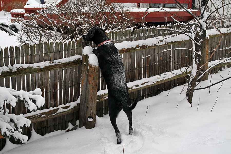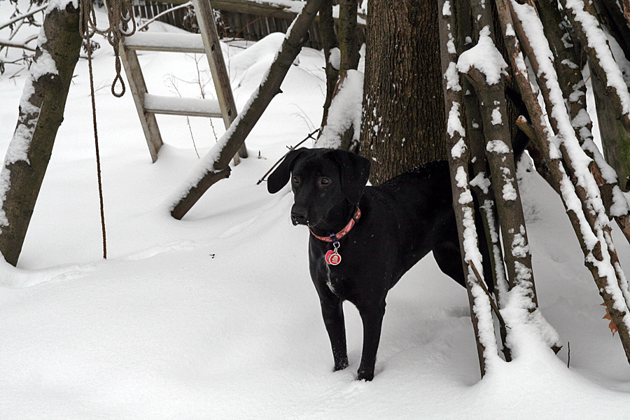 fresh snow in the backyard is good because that means when hailey comes back into the house her paws are just wet, not covered with mud. i was outside with her briefly before my sister came home and took her "into the woods."
