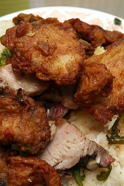 by early evening my parents swung by my place briefly to drop off the takeout they'd gotten me from chinatown. the food was cold by then but i wouldn't have dinner until hours later. it was the R45, the spicy fried pork chop on rice that i love so much. the serving size is really meant for two people; i realized that too late when i'd already consumed 3/4 of it and started to feel sick from overeating.