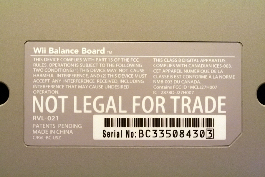 the wii fit arrived in the early evening. it's a lot heavier than i thought (about 10 lbs.) which makes it feel stable and durable. on the bottom was a "not legal for trade" warning sticker. what's that about? i ran the initial setup where it asked me for my age and height, and based on my weight, calculated out my body mass index.