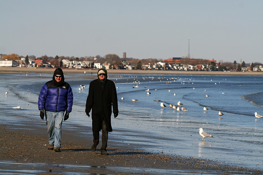 bruce and jack were driving down to revere beach to take a walk and invited me along. the last time i was down there was a july evening last summer (coming back from a party in winthrop) where i briefly saw some fireworks. the weather was in low 40's with some wind, but the sun was shining so it was too bad. there was only a handful of people on the beach, everyone bundled up in their winter jackets. i hid my camera in my jacket when i wasn't shooting to prevent windswept beach sand from getting into the lens.
