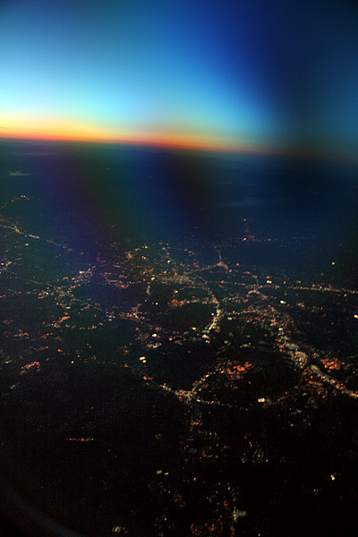 for $2 you can buy a can of soda or a bottle of water, $1 for coffee or tea, and $7 for beer or cocktails. most of my other fellow passengers were probably just as disappointed as i was in having to pay for something that used to be free, so there weren't many takers. as another cost cutting measure, there was an ad for AT&T printed onto the surface of the collapsible trays. i'd never been to charlotte before but got a quick tour of the airport because i had to move from gate E to gate A on the other side. thank god for moving sidewalks! charlotte airport seemed more like a cozy mall than a normal airport, with a plethora of commercial storefronts and even empty rocking chairs for people to sit down and relax. my flight to birmingham was due west, so essentially the plane was chasing the sun as it was setting, rendering the outside landscape in a perpetual state of twilight.