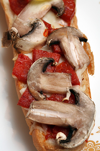 the first two i made had pepperoni and mushrooms. i used bread from the tip, which is narrower, that's why i didn't feel like i had enough. the next two i made had pepperoni, olives, and some fennel seeds scattered within the tomato sauce.