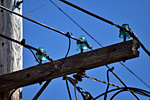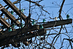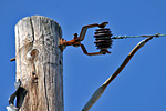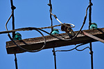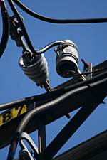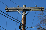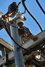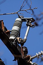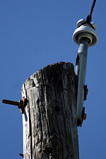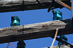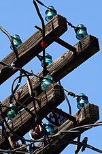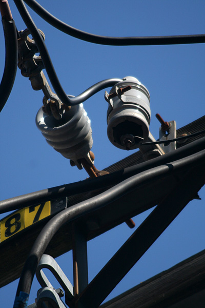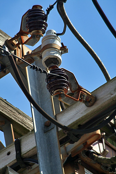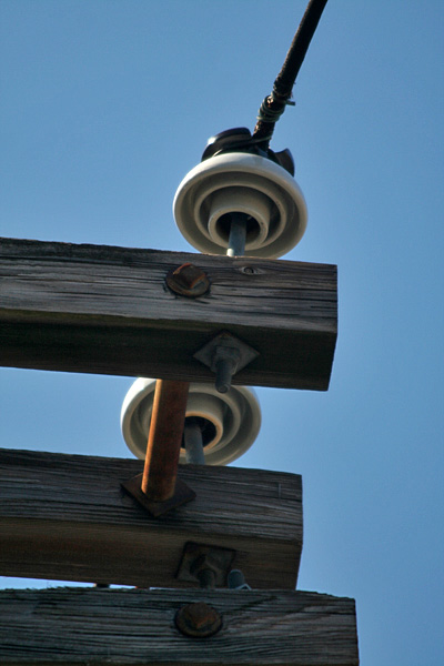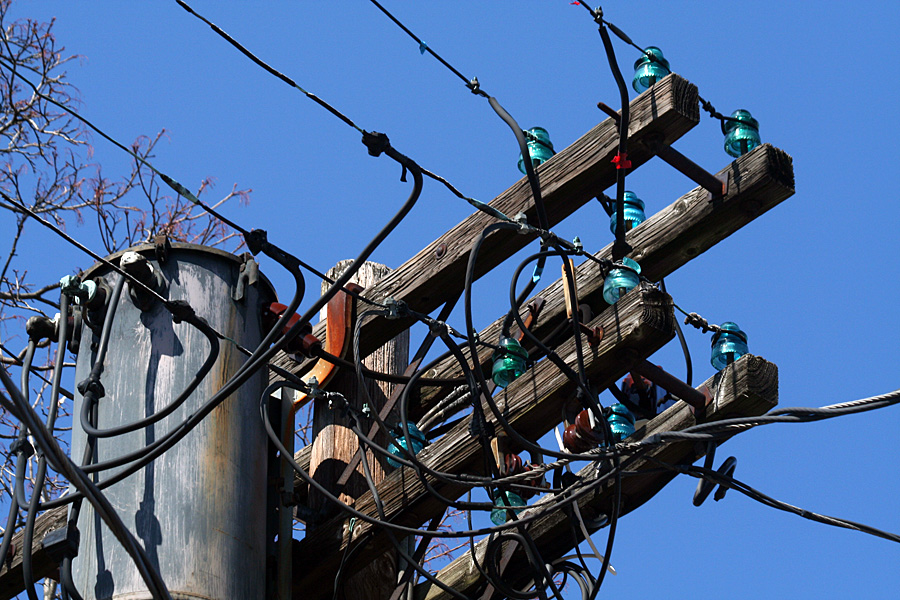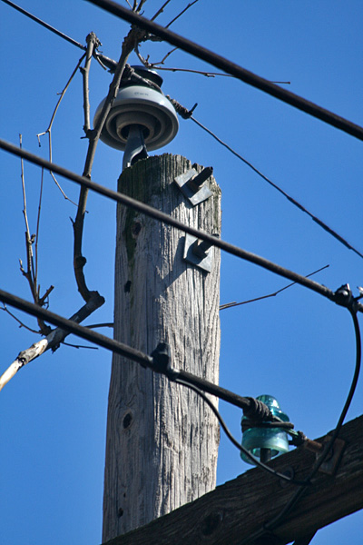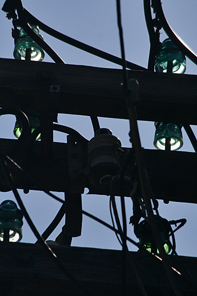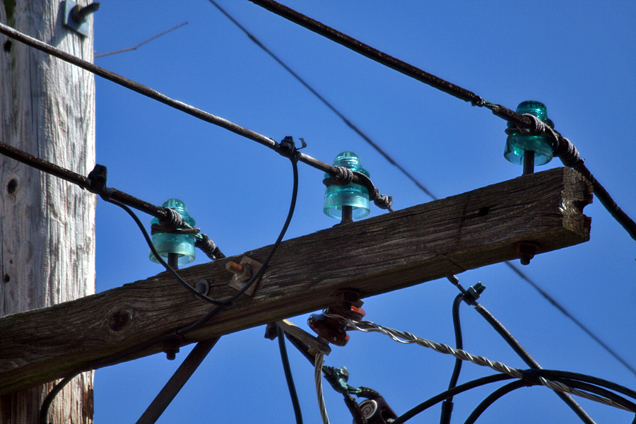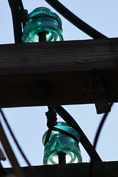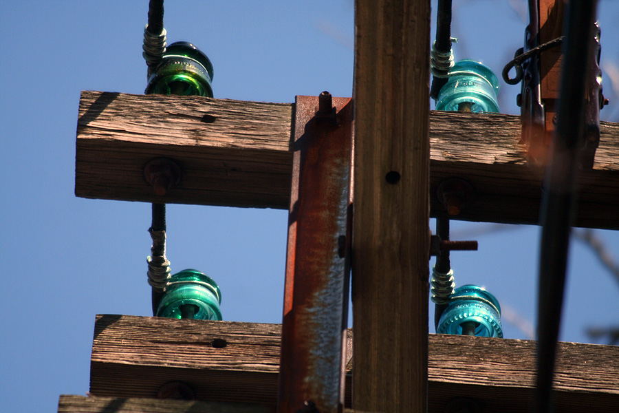 have you ever thought about where electricity comes from and how it gets to your house? i know they travel on those telephone/utility poles (unless yours are buried underground), but i know nothing more beyond that. i was coming back from my run yesterday, walking up ash street, when i looked up a utility pole and saw these beautiful translucent blue-green colored knobs that resembled either upside down shot glasses or votive candle holders. after staring at them for a few minutes, i sort of figured out they were acting as insulators for the electric cables. i never gave it much though, but it makes sense that these cables aren't just nailed to utility poles, that some sort of insulation was involved, otherwise people would get shocked whenever they touched a pole. as i continued walking home, i kept looking up and identifying all the different kinds of insulators. however, only on ash street were there glass ones, while everywhere else they were ceramic/plastic.