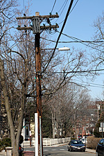 it came as a complete surprise, but there were a bunch of utility poles with glass insulators along shepard street, at the intersections with avon and walker. the ones here were similar to the ones i saw on ash street, except i noticed a clear glass insulator, and another one that was entirely green.