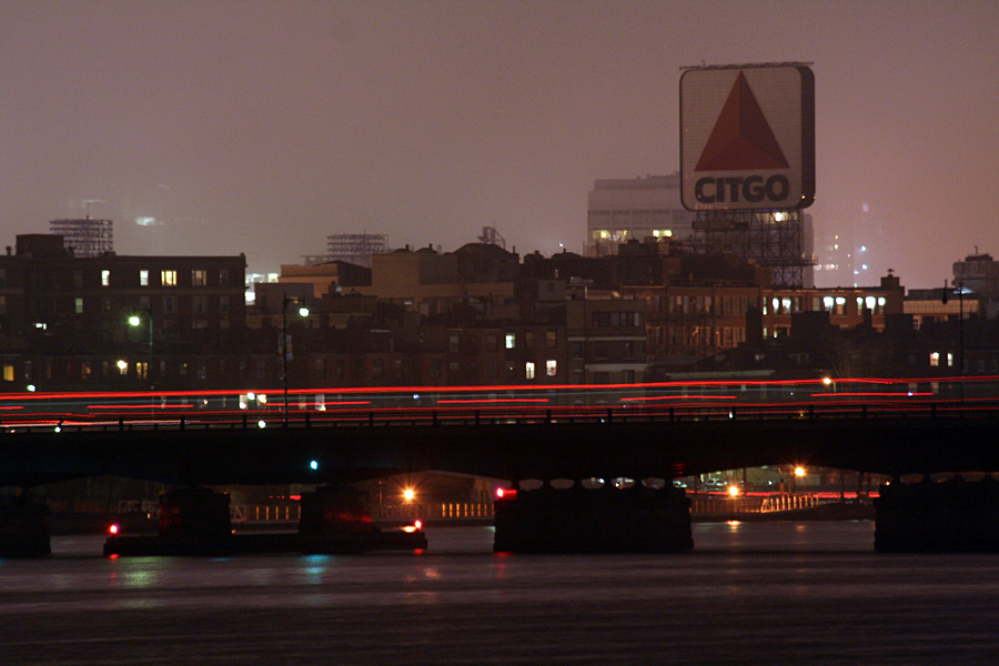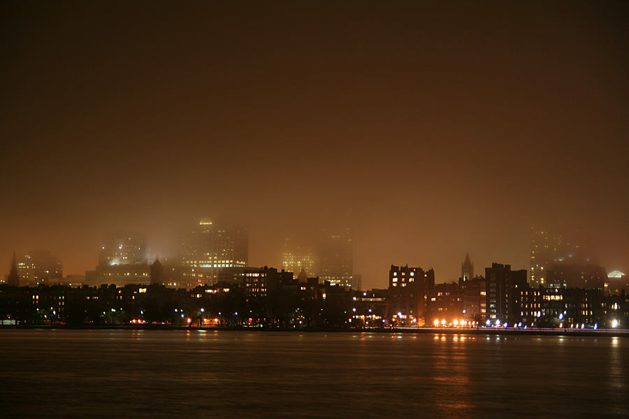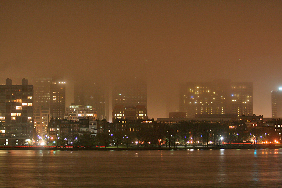 i left the house at 8:00 to take some photos of the city during earth hour, when several buildings and landmarks around boston will turn off their lights for one hour starting at 8:30. it was in the 40's, but i was dressed for the weather and was only traveling a short distance via motorcycle. i headed to MIT, to the banks of the charles river. several other people had the same idea, as two other camera people with tripods set up their equipment along the railing. i had my tripod as well, shooting at ISO 100 with exposure times as a long as 45 seconds. i want to do more long exposure photography this season, but first i may need to invest in a better tripod. the one i use is a simple plastic one, but because it's so light, the slightest wind causes unwanted vibrations. although the biggest problem tonight was the fog, which obscured the two tallest skyscrapers, the hancock and the prudential. when earth hour began, i hardly noticed. one of the hotels turned off its red neon light, and the citgo sign went dark. whether the prudential or the hancock shut off their lights i couldn't tell because of the thick fog. it was all pretty anticlimatic, i think maybe i was expecting to see the whole city in pitch black, but to be honest, probably most people didn't even realize this was happening. i stuck around away, switching lenses, shooting with my telephoto. i was the last person to leave, my camera equipment slightly damp from all the moisture in the air.