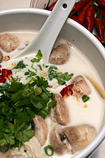 for dinner i made a thai chicken coconut soup. first i quickly boiled some chicken breasts, shredding the meat with a pair of forks. i brought 2 cans of coconut milk + 1 can of chicken stock to a boil on medium heat, before adding in some chopped lemon grass, crushed peppercorns, and some ginger slices (recipe called or galangal, which i didn't have, i'll buy some next time and put it in the freezer). i left everything to simmer on low heat for 10 minutes, before draining the soup, throwing away the solids. into the pot goes the shredded chicken, mushrooms, and some baby corn. let everything simmer again for another 10 minutes or so, serve with a dash of fish sauce, thai hot chili pepper, scallions, and cilantro.