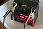 despite the fact that it's a 6 volts battery, it actually recommended charging at 12 volts (the standard for cars), instead of the 6 volts i was using. i did that (at 2 amps, didn't want to fry the battery) and right away it seemed to be working, the amp meter jumping to 1.5 amps. after about an hour, it dropped down to 1 amp, meaning the battery was building up a charge. 30 minutes later i went back outside to test it on the motorcycle again. there was a slight drizzle and i had to work in the dark with a flashlight in my mouth. i might've scared a neighbor parking her car to see a mysterious person lurking by the side of the street. after i screwed the leads to the battery, i put in the key and managed to start the motorcycle without further problems.