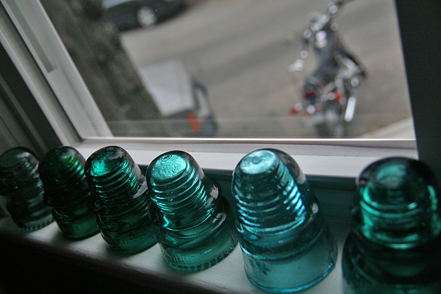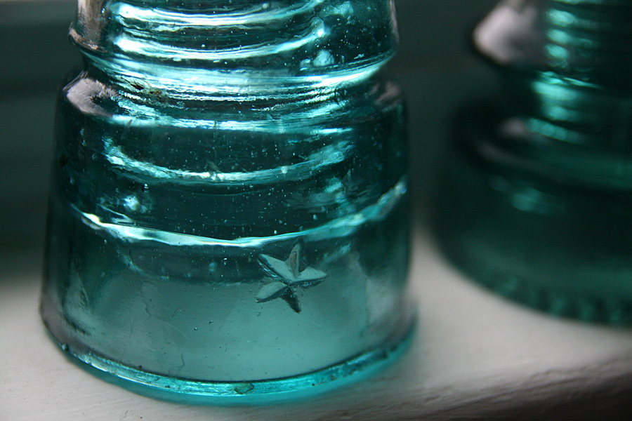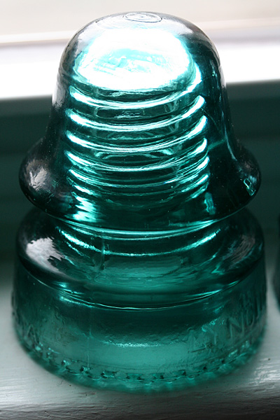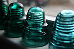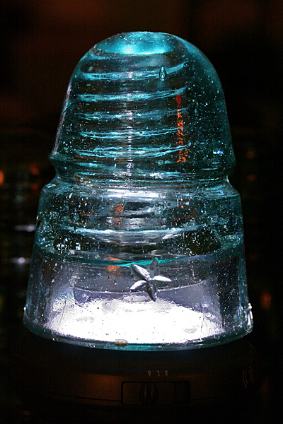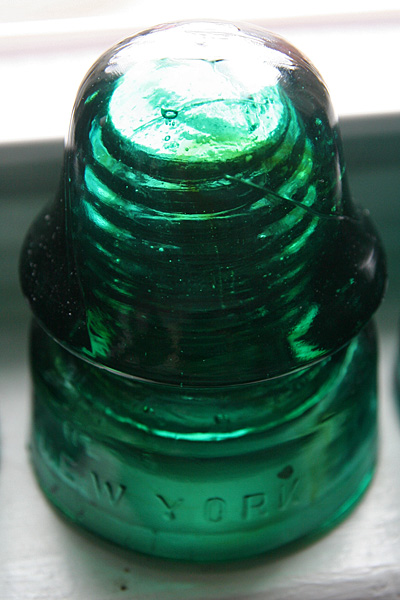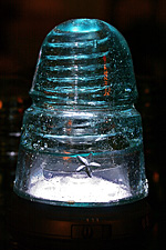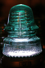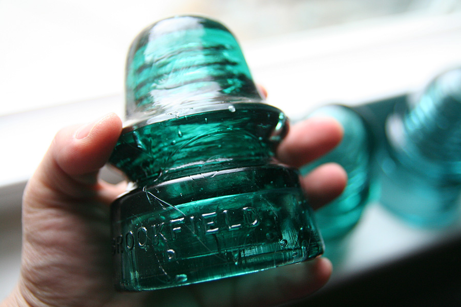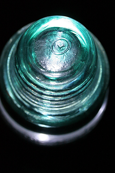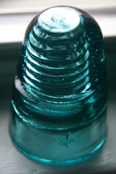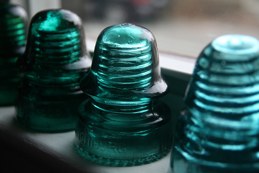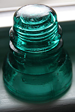 the set of 6 glass insulators i'd won on ebay arrived today along with the mail. a simple box on my doorstep, i was surprised by how heavy it was. i opened up the box to see it was divided into 6 compartments, sort of like what you'd see with a box of wine, except everything was packed in with crumpled newspaper. up to this point i'd already seen glass insulators before, but always on a utility pole many feet up in the air. from that distance, they looked like tiny shot glasses, so imagine my surprise when i had one in my hands for the very first time. these things are big! and heavy! they'd make good paperweights, or a makeshift weapon to brain somebody.