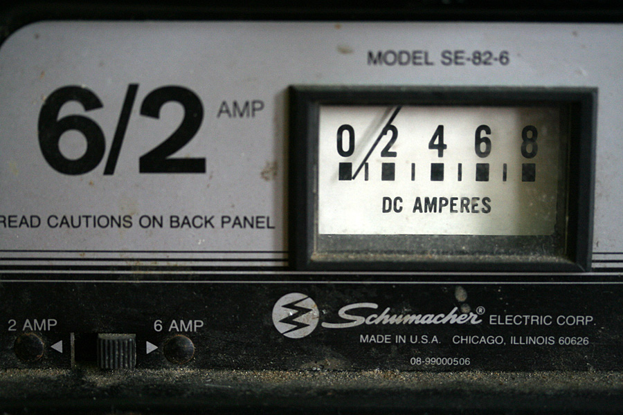 but nothing beyond that. in the afternoon my father brought over his car recharger. i clamped the two alligator clips to the 6 volts dead motorcycle battery and waited for it to come back to life. i had the battery in a plastic container in case it should start discharging sulfuric acid and the whole procedure felt like a movie torture scene,