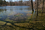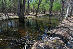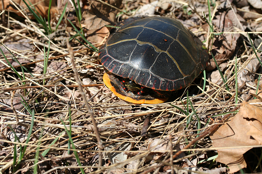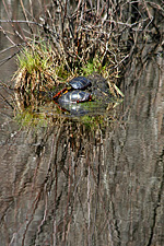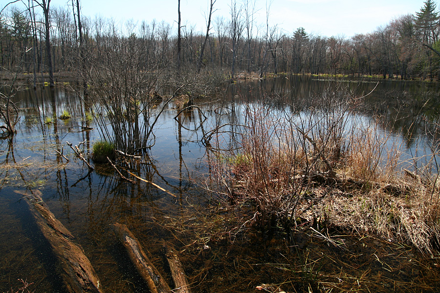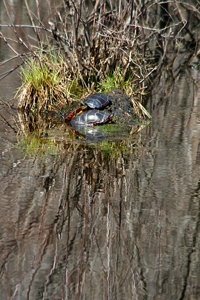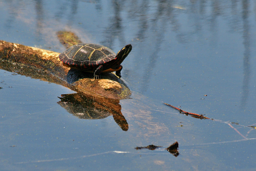 just as i expected, there wasn't a lot to see. the most common wildlife were painted turtles sunning on logs and frogs. the turtles would drop into the water when they heard me approaching, and the frogs would jumping away before i could even see what they were, often times with a yelp before they disappeared. the frogs i did see were all green frogs, and none of them were particularly green, more murky brown.
