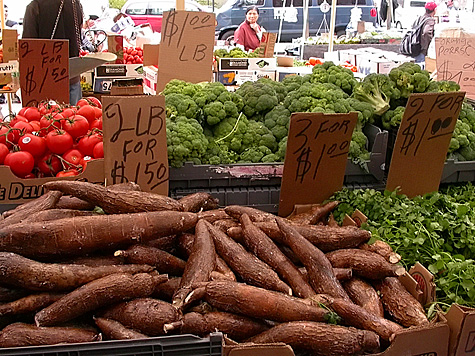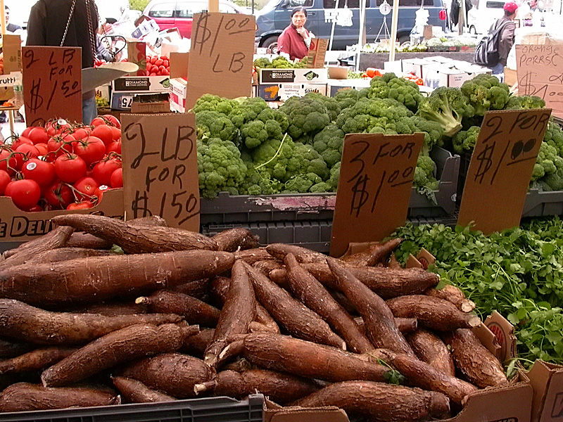 the sky looked grey but the doppler radar showed no imminent threat of rainstorms, so i made my way down to haymarket this morning for some cheap produce. the boston marathon is on monday so the city is packed with people this weekend. it took a while to find parking, and i ended up slowly circling the crowded north end twice before i found a spot on cross street. it makes for easy shopping when you have a roll of one's because mostly everything there costs just a $1. bag of lime? a dollar. bag of lemon? a dollar. bag of oranges? a dollar. box of strawberries? a dollar. they should call the place the dollar market. for the most part, each vendor sells pretty much the same things. the trick is to find the ones with the cheapest price. even if you do end up paying more, the difference is so small it hardly matters (it's still cheaper than buying in a traditional supermarket). occasionally you do find something different. somebody today was selling large watermelons. i didn't check the price but i'm sure it was cheap. i would've bought one, except i wouldn't have anymore room left in my backpack. besides fruits and vegetables, i also bought a bag of chopped goat meat ($5/2lbs.), the most expensive thing i got today.