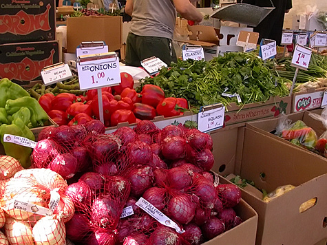 the temperature today was supposed to reach the 80's, but it was still in the 60's this morning. from the outdoor thermometer i could see that it was getting hotter by the hour though. after a quick breakfast of oatmeal, i headed out. i thought about wearing a jacket to keep warm but as soon as i set foot outside i knew a t-shirt with be just fine. i cashed a check at an ATM on beacon street before going to haymarket in boston. there weren't any available spots on cross street so i parked further into the north end in a visitor's zone. i didn't really need anything at haymarket, but my mother asked if i could get some oranges. i bought a bag of 15 oranges for $3, plus 2 large cantaloupes ($3) and two boxes of strawberries ($2). my sister asked me to find some basil but nobody was selling that. the closest thing i found were rosemary and mint (at $1 a bag). there was definitely a lot less tourists compared to last weekend, but still just as busy, with two parallel lanes of vendors compared to just one.