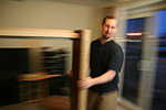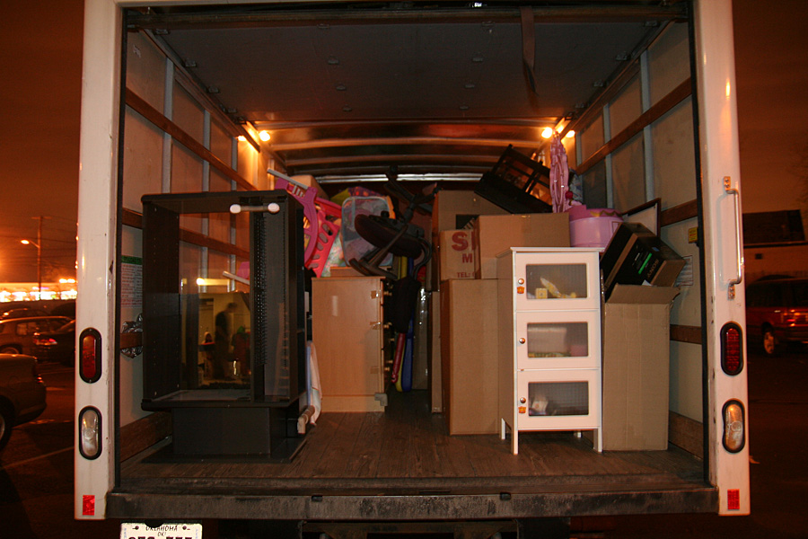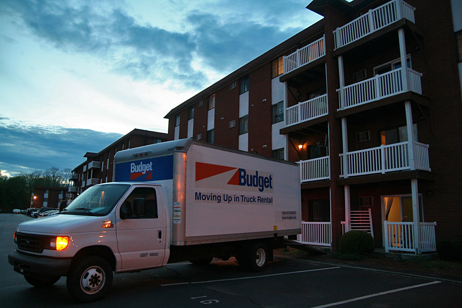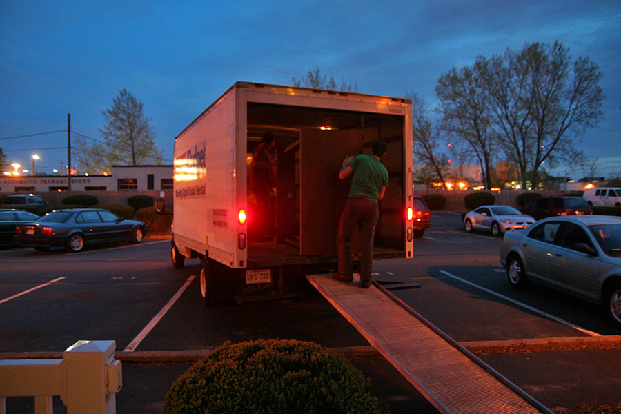 7 mike and elias were part of the moving team as well, and hitched a ride with dan when cymara picked them up at their boston office. dan treated us all to some wendy's prior to the manual labor. they'd originally thought about a 10 feet moving truck but decided on the larger 16 feet. in hindsight this was the better choice: although it seemed like we had ample space in the beginning, as we began to move more and more things into the truck it started to look like we wouldn't have enough space. we were also lucky that dan and cymara decided to ship some boxes, otherwise we would've needed a larger truck. kathy showed up at one point and gave mike a ride home. punam dropped by as well.