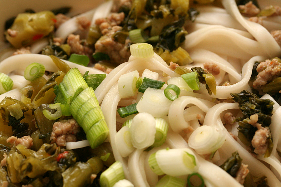 though grey and cold for much of the day, the sun started to break out by late afternoon. this would be a factor in the frost advisory issued by the weather forecast, with parts of western massachusetts under a freezing advisory. i'm sort of glad i haven't transplanted anything yet into my community garden, other than some peas and failed lettuces. i had a hot dog for lunch, then in the evening (while my sister took hailey out to bentley for a run) i had dinner with my parents, some xuelihong (pickled mustard green) noodles.