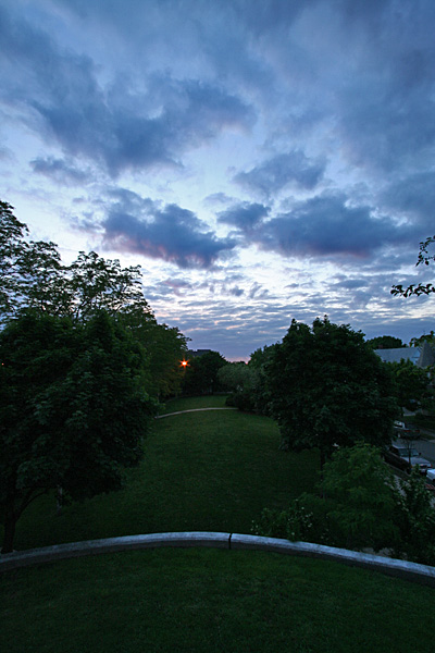 i returned home before it got too cold. wanting to play with the ultra wide angle lens some more, i decided to head to the summit of prospect hill park to see if i can get any good photos. getting to the park is a little tricky, but i kept on repeating "walnut monroe" in my head once i got to union square (up walnut street, take a right on monroe). although a good spot to see the boston skyline from somerville, the wide angle reduced the city to a small speck in the photo. however, there were some very dramatic clouds in the sky, which i took a few snapshots of. once i made it back home, i stashed my motorcycle on a private way since there's street cleaning tomorrow.