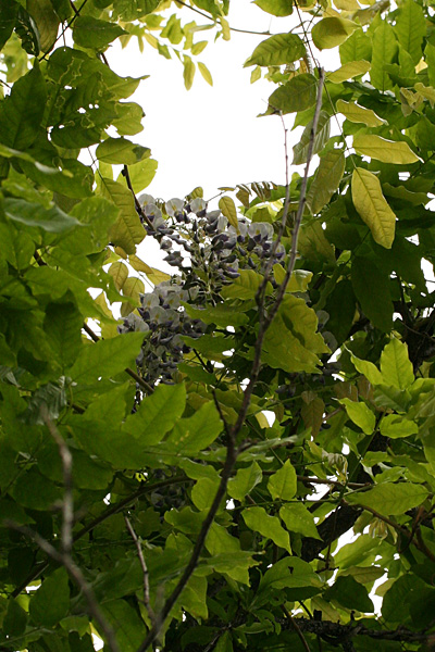 in the backyard, the quince bush has shed all its red flowers and the lilac blossoms are starting to fade. the only edible things growing in the garden are random chinese chive plants and a whole carpet of sprawling mint. the golden raspberries i transplanted from my cambridge community garden are doing well this year and look to produce some berries this season. the biggest surprise today was spotting some wisteria flowers growing on the wisteria vine. that plants been around for 15+ years but we've never seen it flower. since that time, it's managed to climb some neighboring trees. i was thinking maybe it never flowered because it doesn't get enough sun, so when i looked high up on a branch that got a lot of sunshine, that's when i spotted a clutch of wisteria flowers. my father spotted a few more on another branch. unfortunately we may have to cut back the vine because it's growing a little too crazy. that will once again deprive it of sunshine, so i don't know if it'll flower again next season.