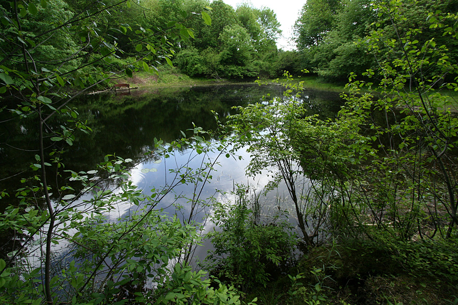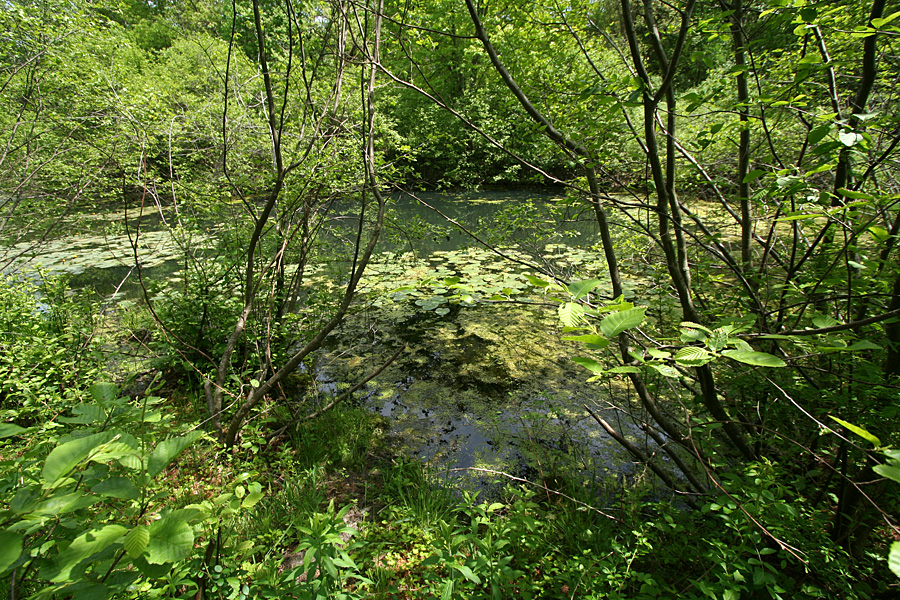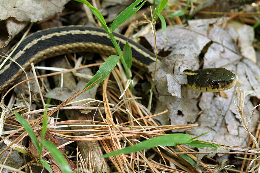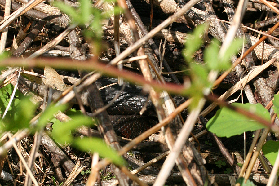 from benjamin pond i followed a path that led me to emma pond. distracted by the honking of a pair of canada geese with some goslings, i suddenly noticed some movement in a nearby undergrowth. it wasn't fast, like maybe a muskrat running away, but more deliberate. whatever it was was also rustling more than one spot so immediately i knew it was a snake, and a fair large one at that. i was hoping to see a racer (only seen it once in my life) but upon closer inspection, i could tell it was just a water snake, coiling itself up and warming in the sun.