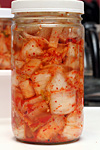 which is the sign of fermentation in action. today however there were even more bubbles. a taste test also revealed that the kimchee has already turned sour, a hallmark of good kimchee. after eating a piece, i could still feel a slight fizzling sensation in my mouth. i debated whether to leave out the kimchee for another day to let it ferment further, but decided the flavor was already good enough. so i screwed on the caps and put the jars into the fridge. hopefully now my house won't smell like kimchee anymore.