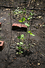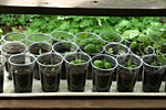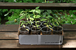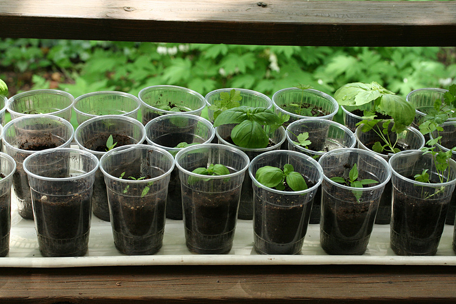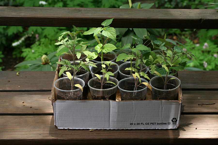 not that they couldn't do with another week under the grow lights, but it's the same grow lights that seem to be inadvertently attracting flies as well (flies get confused, they think the light coming from the basement is a window or a door), an unforeseen side effect. so i borrowed the car and transported all the seedlings to my place before returning for my bike. i put them out on my back porch to let them get used to the weather before relocating them to the gardens.