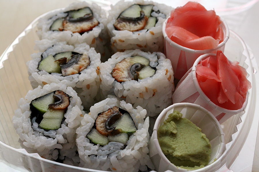 later we watched the lakers nuggets game while i ate my real dinner, a box of grilled eel sushi my mother had made for me earlier.
