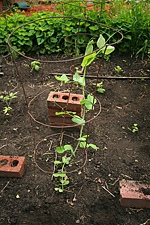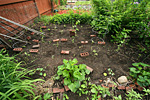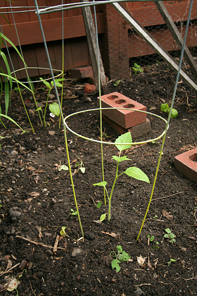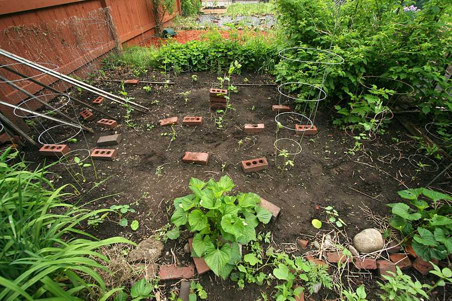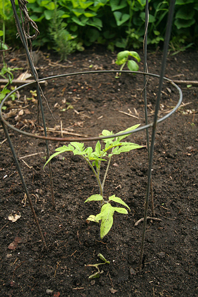 i went to the garden to check up on my plants after the past 2 days of rainstorms. i brought along 3 of my tomato cages to stake into the ground. i was dismayed to see some damage but it wasn't unexpected. weird thing was none of it was weather related though. one basil plant had been torn apart (squirrel?) and another had several leaves chewed by a slug. a cilantro seedling looked like some animal try to uproot it but gave up. other than that, everything else looked fine. i caged my 3 tomatillo plants before i left.