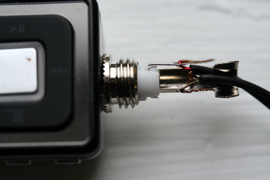 so i went to radio shack yesterday afternoon and bought a replacement 1/8" stereo phone plug ($3.99 for a pair). i snipped off the old jack and snaked the bare wires through the new jack, but it didn't work.