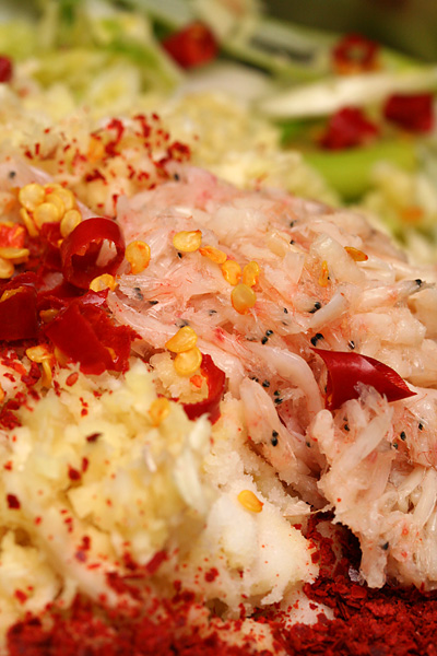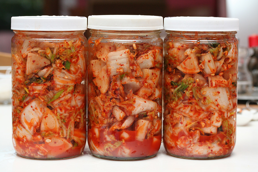 this is basically the same recipe i used last month when i made my kim chee 2.0, but i doubled all the portions, figuring i was making twice as much as before. actually, i was just making 1.5x at the most. i made a mistake with the salt though: last time i used 2 tbsp, but this time i only went with 1.5 tbsp. when i did a taste test it seemed salty enough, so hopefully it'll be okay. i can definitely make it saltier but i rather not because it requires dumping out all the kim chee, mixing it all with some more salt added, then jarring them up again. also i compared photos of the kim chee i made last month, and they seem redder, so i could've probably added another tbsp or two of chili powder. i don't think additional chili powder would make it hotter. my personal opinion is the chili powder is more for show, and that if you really wanted to make spicy hot kim chee, you can use real hot peppers.
