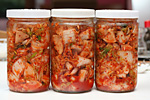 probably at that time i could've also added more salt if i wanted. once everything is properly mixed, i stuffed the kim chee into the jars with my hands. i ended up with 3 large jars of kim chee (one jar is just a smidgen less than the others). last time around, with a much smaller cabbage (but a much large radish), i managed to get 2 large jars and 1 small jar. i'll probably take these jars to my parents to let them ferment, since i'll be having guests staying over my place all next week and i don't think they'd appreciate the smell of kim chee permeating the house (only until i put it in the fridge, which according to the 3-day fermentation schedule would be tuesday afternoon).