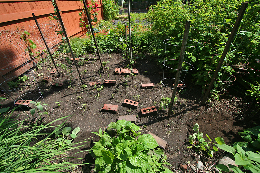 before i finally came back home, i went to check the garden. all my plants are still alive, although aphids have infested my nasturtiums. never saw this before, just another reminder to pick up some insecticidal soap from my father to spray. one of the pea plants is experiencing a crazy growth spurt and jumped across to a neighboring tomato cage. the peas are also starting to flower, so far today i only saw one blossom, a white flower. people actually grow peas for their ornamental flowers and they come in all colors (maybe next year). my plot is starting to get a lot weedier now that the weather is getting warmer and there's more sunlight. i still have to find some suitable mulch for the garden. i'm still waiting on that salt marsh grass. julie told me she has a lot of luck with garden compost, but the compost in our bins look diseased and not very decomposed. also today i spotted another moonflower. not sure how i missed it last time, unless it just sprouted up within the past few days.