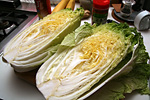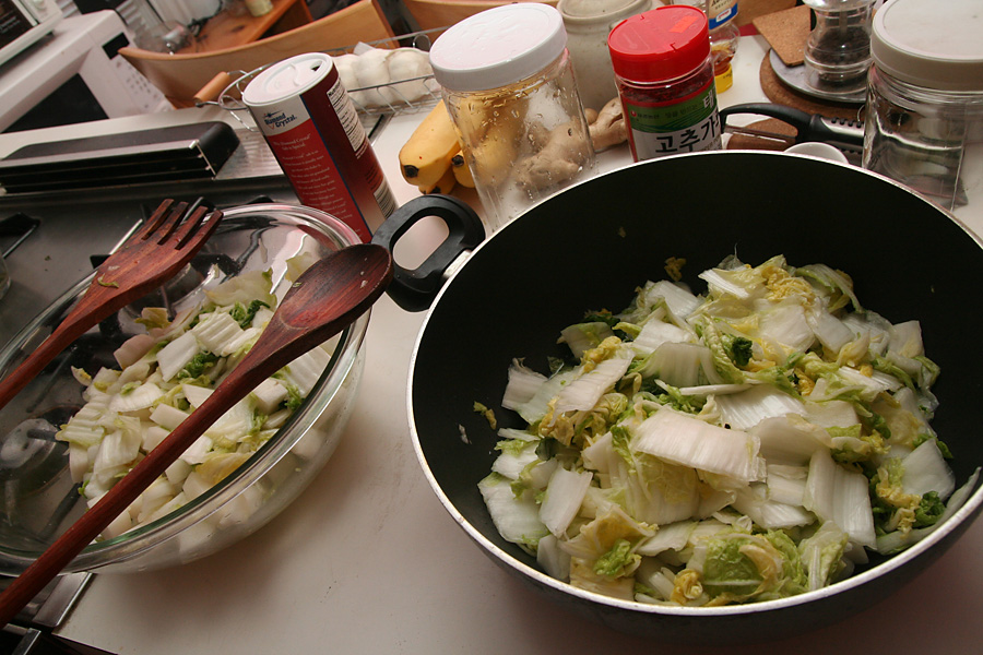 even before i left the house to go to the parade this morning, i woke up and rode down to the cafe to get some kim chee making supplies. i got 3 glass jars with plastic lids (jars that used to be for store-bought kim chee), an 8" long daikon radish (a bit soft, but it would've turned soft anyway, after i reduce it), and a piece of ginger. back at home, i chopped up the napa cabbage into 4 pieces the long way before chopping them up again into approximately 1" squares. i also chopped up the daikon into slices and chopped them again into 6 piece wedges. i didn't have a big enough pyrex glassware container so i split half of it into a wok. i poured several tablespoon of salt into each container, then tossed the cabbage and the daikon. i left everything to reduce before i left the house at 11:00.