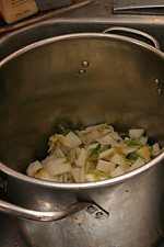 when i came home around 3:00 (after the parade et al.), i poured out all the liquids and them gave everything a quick rinse (probably not really necessary, i'll probably forgo this step in the future). i put all the reduced cabbage and daikon pieces into a tall metal pot. i then started preparing the other ingredients: