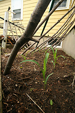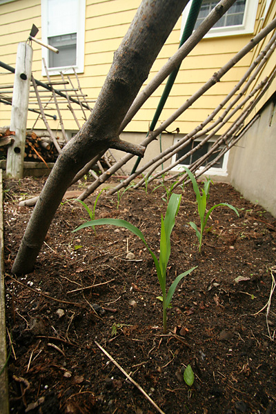 as soon as we got back to belmont, the rain stopped. and actually, it didn't even seem like it had even rained here. i went out in the backyard to look around. not much change, although the corn seemed to be bigger than i remember them a few days ago.