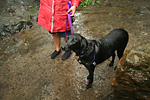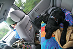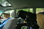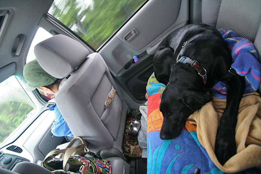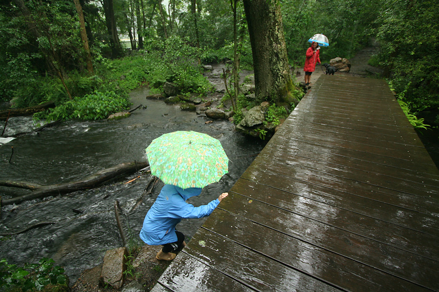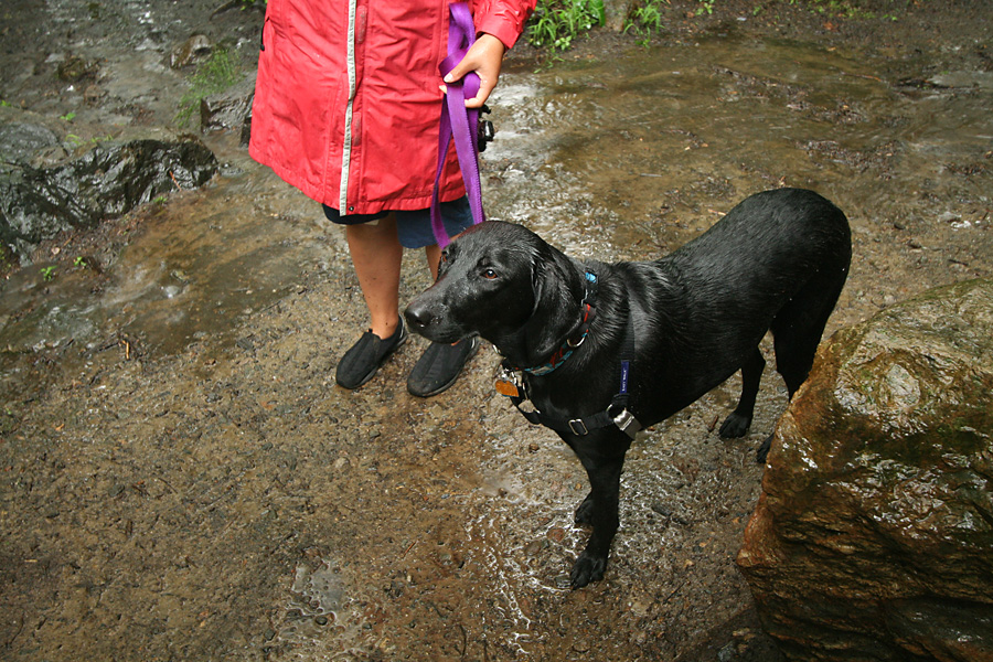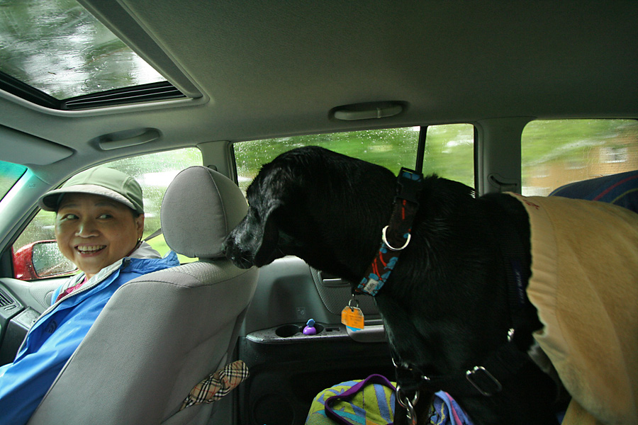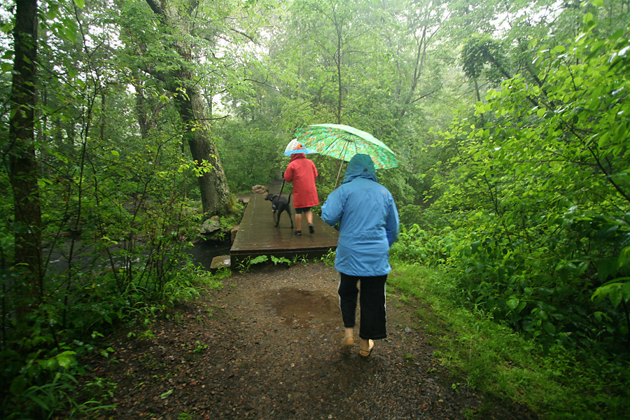 i went with my mother and sister to weston, to take hailey out for a trail run in the forest. there was a slight drizzle when i rode up from cambridge, but they were confident the rain was over. since i had my camera, i couldn't risk getting wet, so i brought along an umbrella just in case. the further we got on the highway, the more it started to rain, until it became a torrential downpour. we thought about turning back but were hoping the rain might stop when we arrived. when we got there it was still raining just as hard and had no choice but to turn back. hailey had already noticed we'd arrived and was getting excited for her run, but when we started to leave, she sensed something was wrong and started to whimper. so we turned around after a few minutes, and decided to let hailey decide if she wanted to run in the forest with the rain. i at least had an umbrella but my sister and mother just had their ponchos. fortunately they found two spare umbrellas in the back of the car. originally i thought the run space was just a large enclosed grassy field, but turns out there's a nearby entrance that leads into an expanse of forest trails.