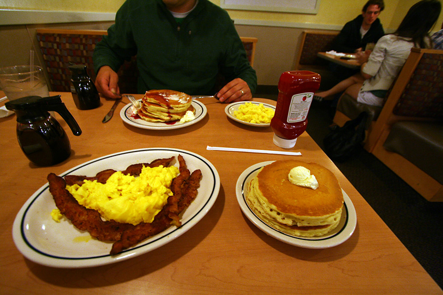 john, completely obsessed with cycling, admired all the many bicycles we encountered along the way. IHOP seemed to be empty when we arrived (they close at 4:00), but business soon picked up. customers for the most part seemed to be young night owls, coming to one of the few places to eat that's still open this time of the night. i can't even remember the last time i was at an IHOP; it might've even been back in college, when an IHOP still existed on concord avenue near fresh pond. john ordered the 5 stacks of pancake with a side of scrambled eggs, which i had the 3 eggs 3 pancakes combo with a side of bacon strips.