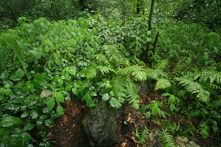while my sister and mother were far up ahead, i lagged behind, surveying the wildlife. i haven't gone out naturing in a while, and i almost never do it in the rain, so it was a new experience for me. the predominant vegetation were poison ivy, jewelweed, and various species of ferns. my mother and sister had already disappeared down a muddy and wet trail before i saw them coming back again. i thought maybe they were just checking up on me, but turns out they'd decided to head back, since hailey herself wasn't interested in running around in the rain either. so in total we probably just spent about 10 minutes in the woods, getting soaked, before we left.