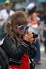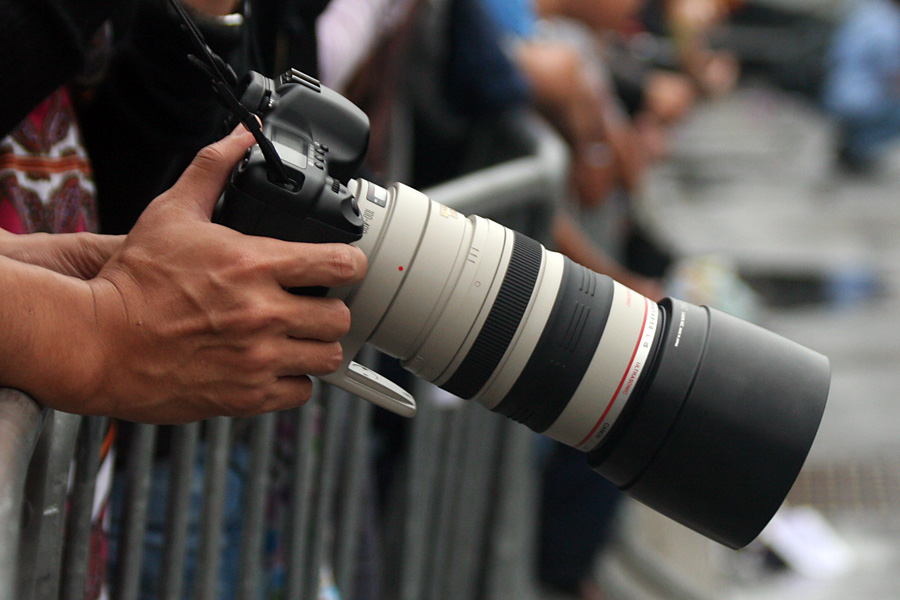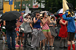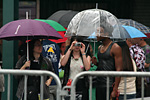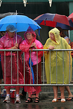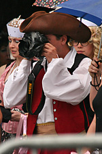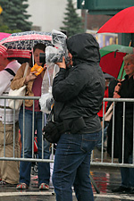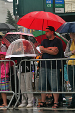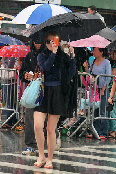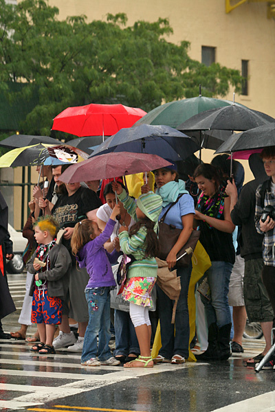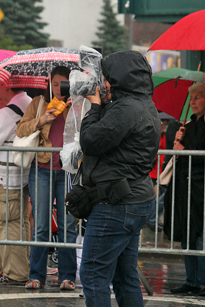 the rain was still coming down when the parade finally started. the crush of people behind me were compounded by the fact that everyone had umbrellas, which would occasionally get tangled up. everyone once in a while i'd get an umbrella tip poking me in the back of the neck. the rain from the umbrellas would also runoff on me, but fortunately i was wearing my waterproof windbreaker. it was hard to man the telephoto while holding the umbrella. a few times when it felt like it wasn't raining that hard, i closed by umbrella so i could better use my hands. after each series of shots (with or without umbrella) i'd inspect the camera, wiping off any water on the lens and the filter. fortunately for everyone, it stopped raining by the second half of the parade.