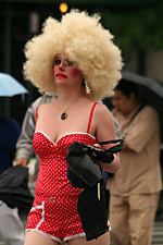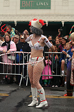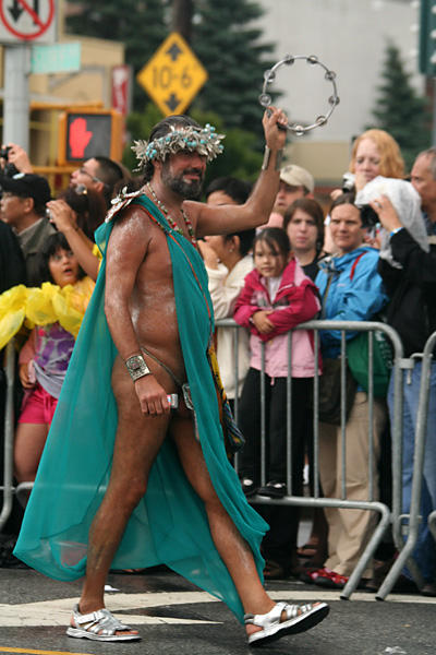 i made friends with an old italian lady from queens who turned out to be spanish (from spain). she was there by herself as well, and came just with a hat and a handkerchief to put as an armrest on the wet metal barricade. she'd never seen the mermaid parade before wanted to experience it for herself. so was an independent spirit and was telling me how her daughter wanted to take her on vacations but she preferred to go by herself because her family would slow her down. i told her i was from boston and she said she would like to visit there one of these days, to see all the history. the more i talked with her, the more i realized she was a little old hater, which didn't make her any less endearing. after watching a few near topless women walk by, she was telling how there's a lot of bad people around. she singled out vietnam veterans in particular, "they're all crazy" in her thick accent. she also didn't like how "orientals" come to the country without knowing how to speak english, although to her credit she had a theory that their writing was far too different from english (unlike, say, the difference between english and spanish). some other old ladies were jockeying for viewing position next to us, and one of them casually asked what time the parade started. after a brief pause, i blurted out, "2:00." they left soon afterwards for a better spot, but my new friend told me, "i don't like rude people, that's why i don't tell them the time."
