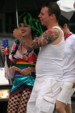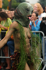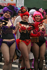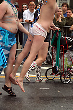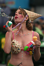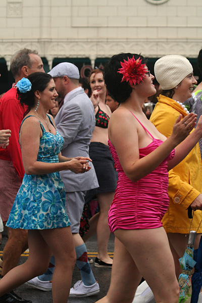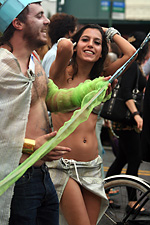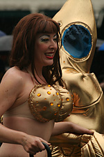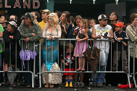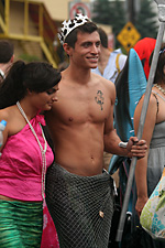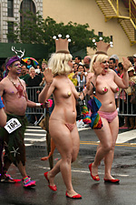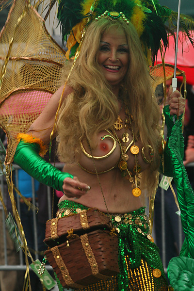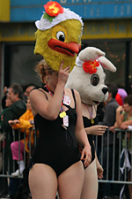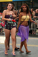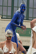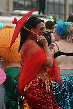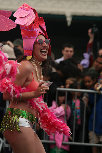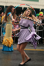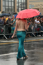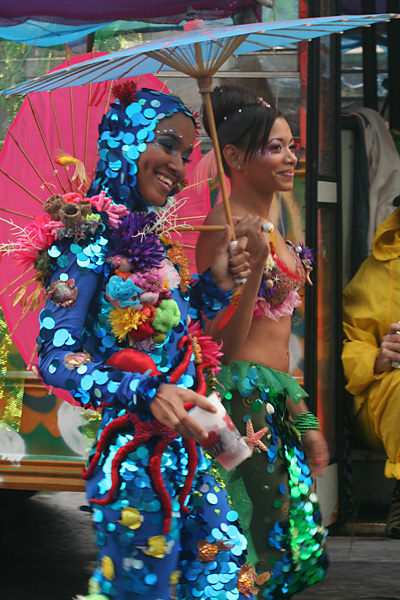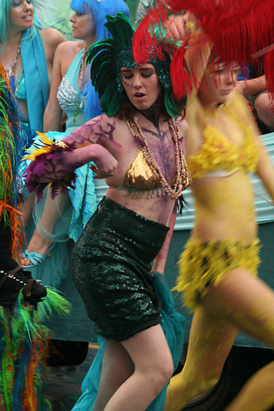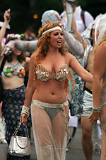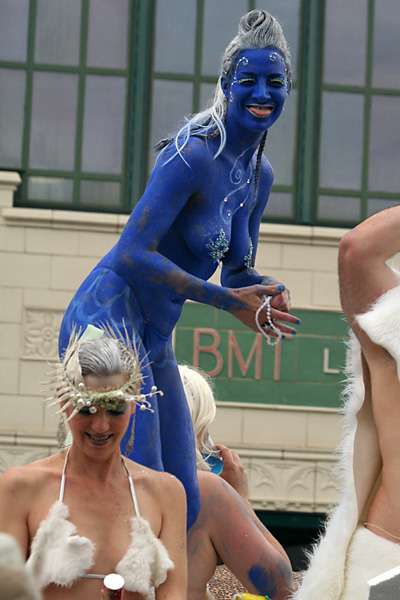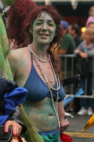 naturally, one of the attractions of the mermaid parade is the seemingly inexhaustible supply of breasts on display. though many still wear pasties to modestly cover up, it doesn't leave much to the imagination, and some just completely forgo such formality and go full topless. as much fun as it is to watch the people marching, it's just as interesting seeing the spectators' reactions. a lot of furtive and not-so-furtive looks happen thereabouts. i'm always surprised by the parents who bring their young children though. but i say fostering a healthy appreciate for boobage at a tender age is a good thing; certainly attending the mermaid parade will get you your daily recommended visual diet of boobies (natural and/or fortified).