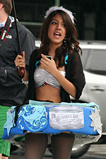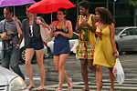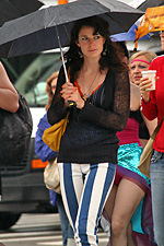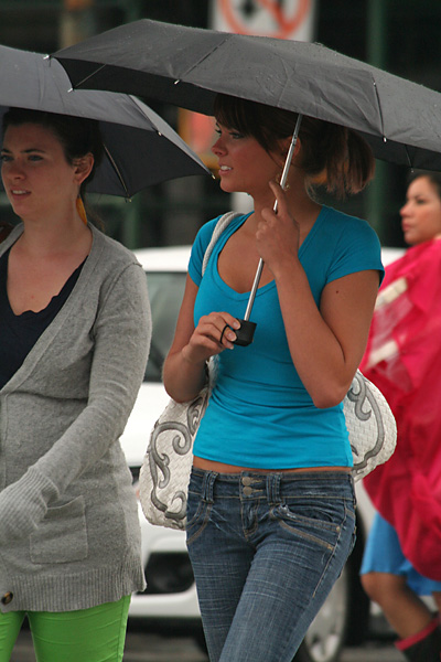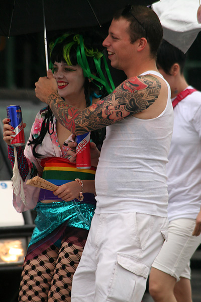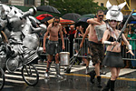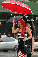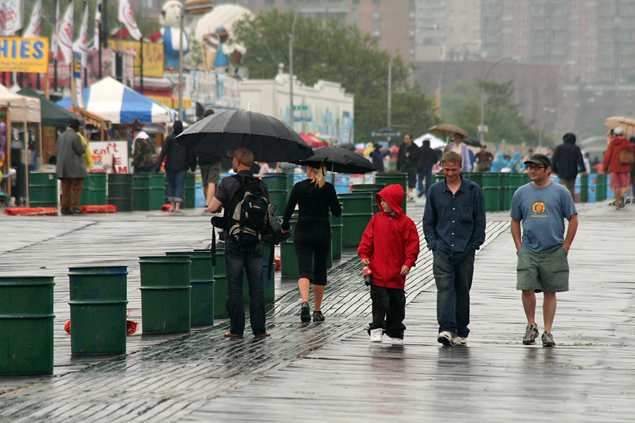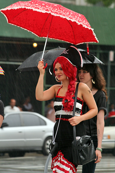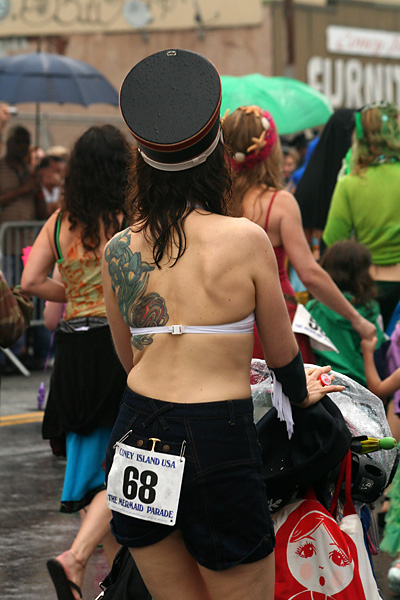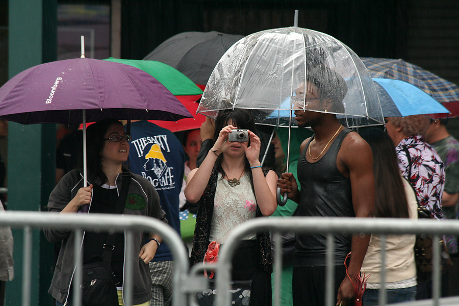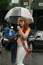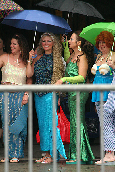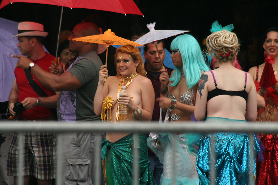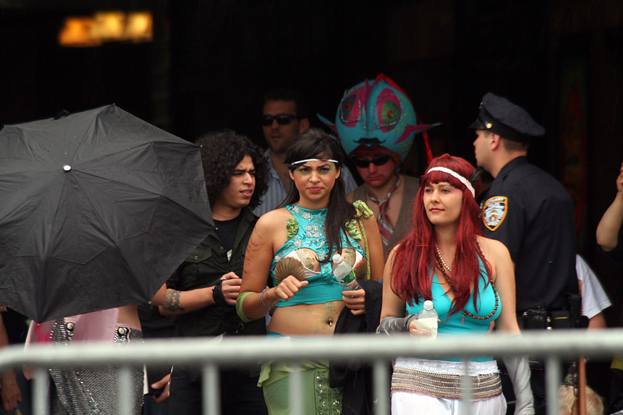 apparently we had some pretty good real estate because everybody wanted to be where we were. 2 coeds stuffing their face with nathan's hot dogs ended up taking the last remaining spots, their umbrellas dripping onto us. my spanish friend was not happy, and she wasn't very talkative after that, just hemming and hawing her displeasure. there was a brief pause in the rain before it picked up again, this time at an almost downpour speed. even though little spanish lady was safe underneath the combined canopy of umbrellas, she couldn't wait anymore and decided to leave, suddenly disappearing without even saying good bye. this was a horrible day to have a parade. it rained one other time, in 2006 (my first mermaid parade), but just a slight drizzle, nothing like this. in comparison, last year's weather was so much better, hot and dry with temperature in the 80's. at least i wouldn't get sunburnt.