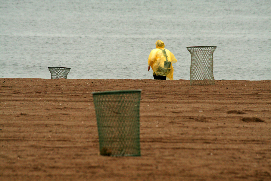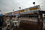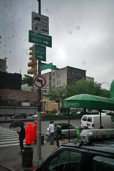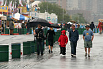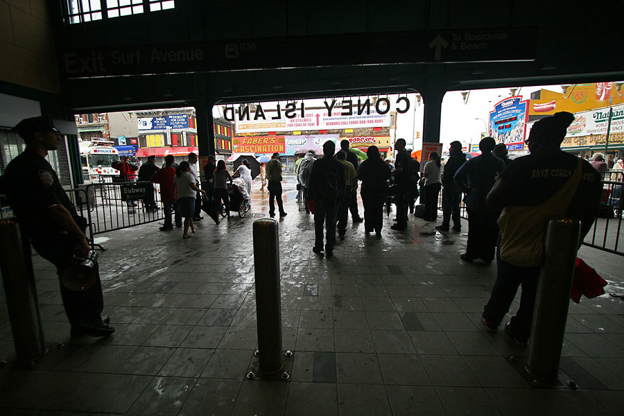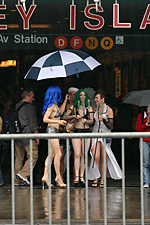 i got to coney island at noon. i used the public bathroom (urine on the floor, try not to look) once before i left the station as a safety precaution. it was still raining, now at a faster pace. barricades on the commercial side of the street had already been set up and there was a sizable police presence in anticipation of the crowd later. i walked through the amusement park and down the boardwalk. there were no beachgoers except for the few curiosity seekers (sporting lovely ponchos) and the flocks of seagulls (yeah, that was an 80's reference). that took less than 30 minutes. with nothing else to do, i decided to find my spot along the parade route. this being my 4th year, i knew exactly where to stand: directly opposite the entrance of the subway station. this way, when parade participants got off the trains, i could get a sneak preview of what's in store (since most of them arrive in costume, which can make for an interesting subway ride).