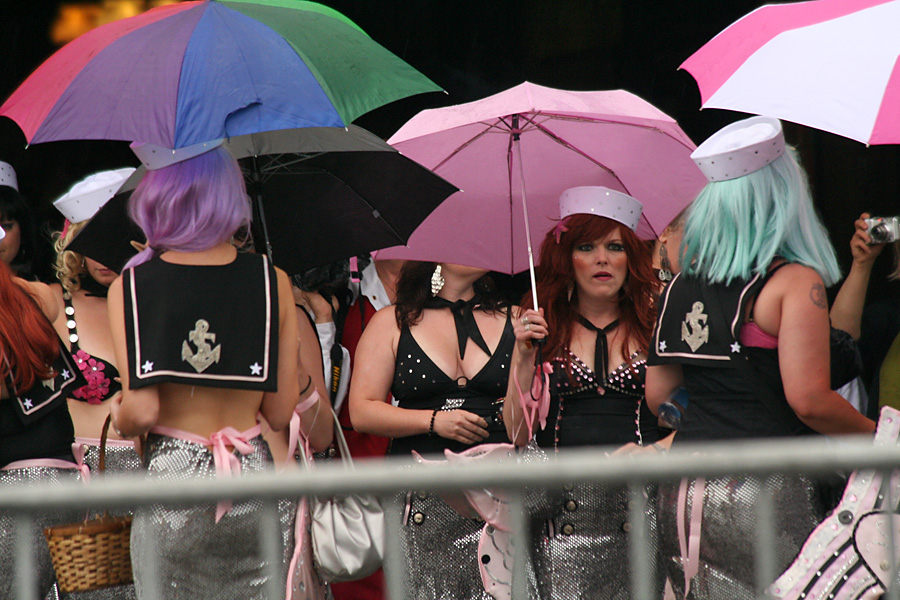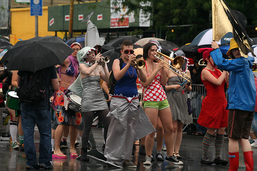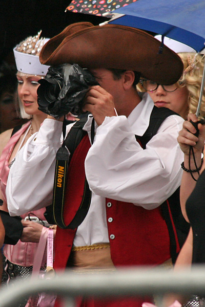 i shot with my telephoto, which i now use pretty much for any parade events. i always hear that professional photographers prefer a grey sky for the neutral colors. a sunny bright day might be better for a parade, but not so much for photography as you get areas of deep shadows and overexposed bright areas. when everything is grey, you don't have that problem anymore, and subjects become evenly lit, albeit a few stops down compared to a bright day. i had my umbrella to keep the rain off the camera lens, but i saw people with other strategies, including custom camera ponchos for dSLR's and even makeshift ones made from plastic bags. i thought about making my own but since my lens extends outwards depending on the zoom, it'd still get wet. and raindrops would still collect on the front of the lens and would require constantly wiping.