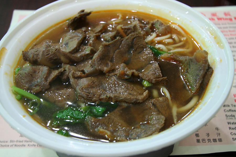 i decided to check out a place behind confucius plaza on 21 division street called lan zhou hand pulled noodles restaurant. i love restaurants with literal names; takes the confusion out of figuring out what kind of food they serve. the place was empty when i arrived but open (marco polo didn't open until 11:00, back when it was still around). i ordered the house special, the standard spicy lan zhou beef noodle soup ($4.95).