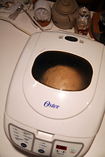after a late lunch of toaster-oven fried kielbasa and a poached egg, i did a load of laundry, washing the bedsheets and some towels. i also set the bread machine to prepare some pizza dough for later tonight: 3 cups of flour (actually, 1.5 cups of white bread machine flour + 1.5 cups of brown whole wheat flour), 1/2 tsp of salt, 1.5 tsp of yeast, a cup of warm water, and 2 tbsp of vegetable oil. after the machine kneaded the ingredients into a large dough ball slightly larger than a softball, it sat idle, waiting for the dough to rise. by the time it was finished, the dough had risen and completely filled the pan. i took out the dough and put it in the fridge sealed in syran wrap.