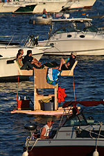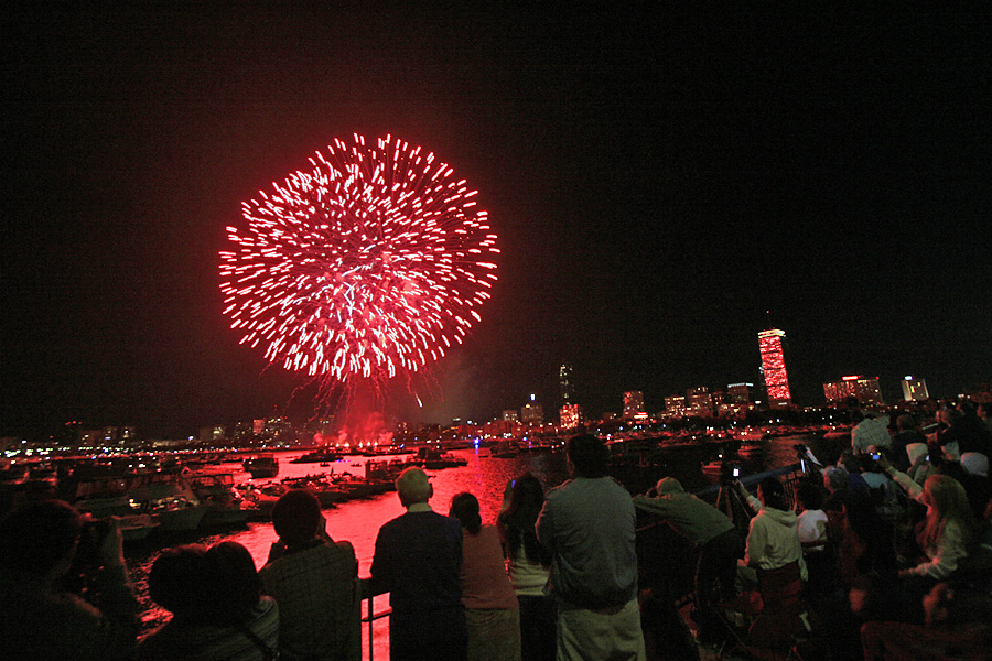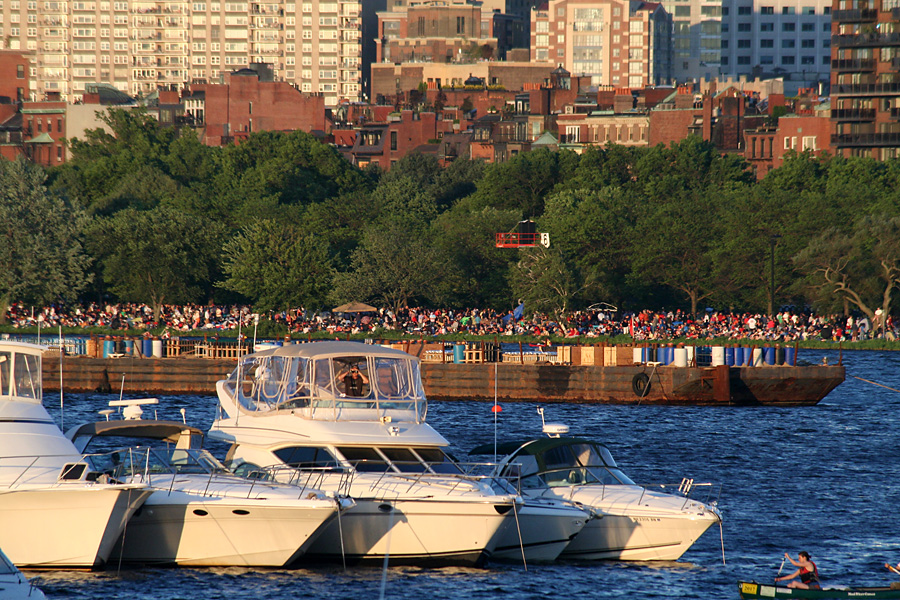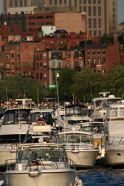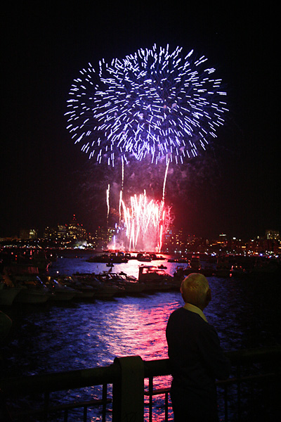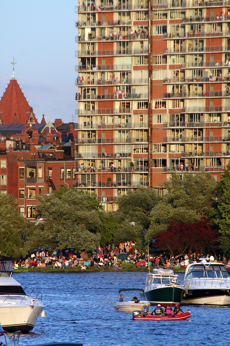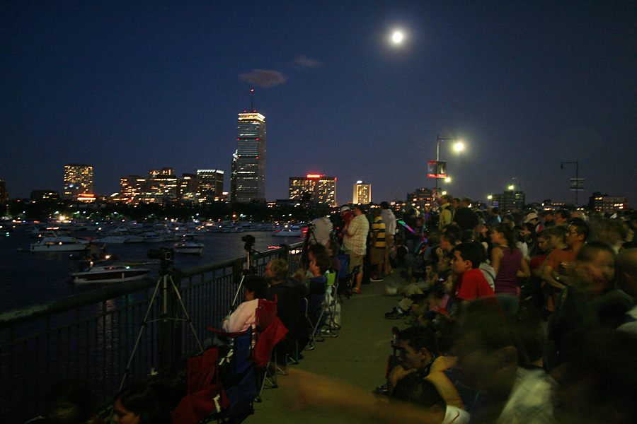 i sat by my usual spot along the mass ave bridge. at 7:30 there were still a lot of empty railing seats but they were quickly filling up. i was right by a light post, which would later serve me as a stationary tripod (i ended up not using my folding tripod). i sat next to an elderly chinese couple and their twentysomething son who had staked out a fence spot with his nikon D50 mounted on a tripod. i was in a friendly mood and ended up chatting with them. the wongs were from beijing, visiting their bioengineer son in boston for a month for the very first time. he himself have been in boston for the past 3 years, but spent 6 years in birmingham, alabama for his graduate work. he was also crazy asian camera guy, switching out lenses, fiddling with his equipment. his father was also busy taking photos with a point-and-shoot, not sure what he was photographing, my guess is cataloging the various types of americans. at one point a smelly russian boy squeezed in between us. he asked me what time the fireworks start, but seemed annoyed when i told him, like he thought i was lying. he left soon afterwards, replaced by some weston teenagers.