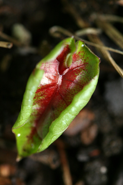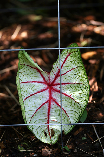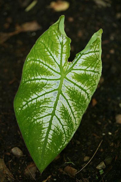 including a single small john peed representative. caladium leaves are actually pretty tough, very similar to cabbage leaves. nevertheless, a few still show signs of early slug damage, although not enough for me to camp out at nights with a container of salt.