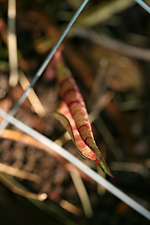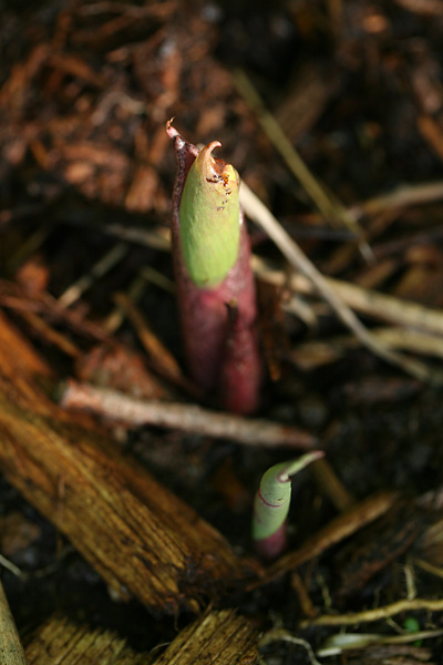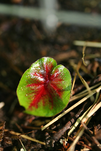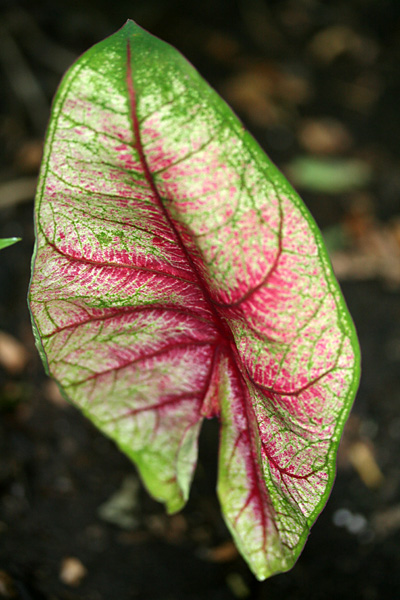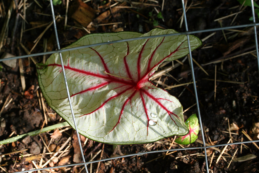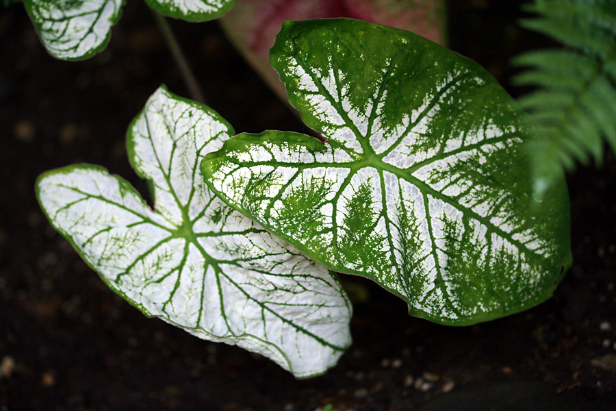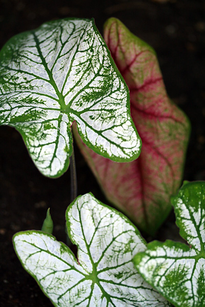 a new variety of caladium joined the ranks of the white queens, the john peeds, the candidums: i think it's a "fire chief," with its green margins, red veins, and splotches of white, pink, and green on slightly peach-colored leaves.
