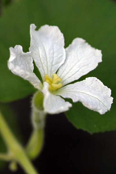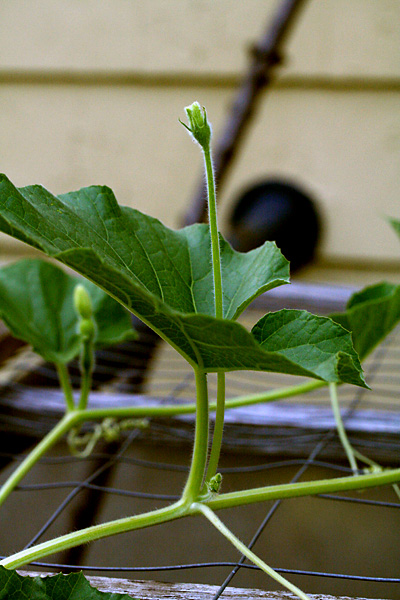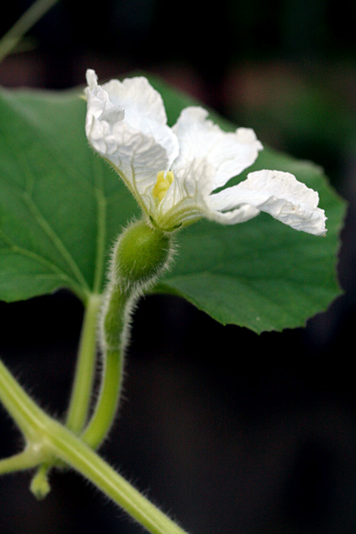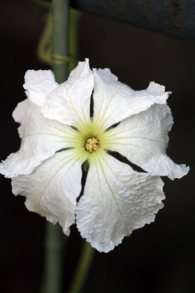 after dinner, my father decided to finish mowing the lawn with what little remained of daylight. that's when he noticed something strange about the squash: the flowers were blooming! from the bits of information i gathered previously, i realized the flowers for this particular squash were white. typical squash flowers are yellow, like cucumbers, but just bigger. white flowers could only mean these are a variety of bottle gourd (AKA calabash AKA Lagenaria siceraria). the nighttime flowering isn't a mistake; they bloom at nights and are pollinated by moths (i did notice a moth on the bathroom window screen; maybe it was waiting for us to leave). so mystery solved! my father thinks these are actually a type of edible chinese gourd.