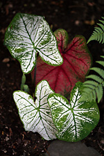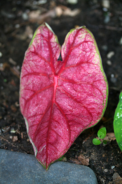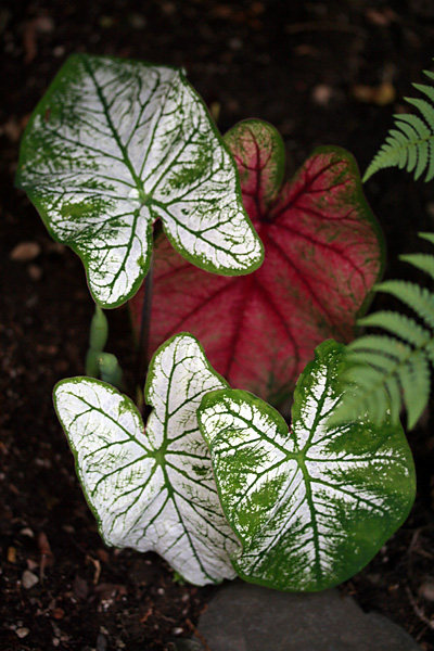 when you're dealing with a shade garden, you learn to appreciate foliage. from a practical standpoint, larger leaves help to collect what little there is of the sunlight. that's why most of your traditional shady perennials - hostas, ferns - are known more for their foliage. caladiums infuse much-needed colors into an otherwise drab shade garden. part of the reason why more people don't add these into their gardens is they require more care than your traditional perennial bulbs. caladiums with thrive during our new england summers but being from a tropical climate, they will die during our winters. that's why they need to be dug out come autumn and stored indoors. caladiums seem to be better suited in pots (making them easier to bring inside) which is what i'll probably do next summer. despite the work, i think it's worth it for the showy leaves.