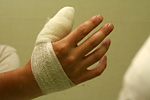 i was asked to lie down on a hospital bed with wheels. an amazingly good looking physician assistant named jason came by and said he'd fix me up. he asked if i wanted any over-the-counter painkillers to ease any discomfort, but i told the pain would reinforce a valuable life lesson regarding knife safety. first he injected me with some powerful local anesthesia. it was a large scary syringe that he jabbed right into my thumb muscles. "this is going to hurt so take a deep breath." it hurt, but soon afterwards my thumb went numb. he injected so much fluid that the palm of my hand was actually slightly swollen. 5 minutes went by, and after a doctor came by and gave him the okay, jason started to clean up the cut. he swabbed the thumb with some hydrogen peroxide. it was all fizzing but i felt nothing, blissfully detached. then he separated out the two halves of my thumb and washed it with a distilled water squirter. when it came time for him to stitch me up, that's when i looked away. even though i wouldn't feel it, the idea of sewing me up turned my stomach a little bit. on the thumb itself i got 4 small stitches,